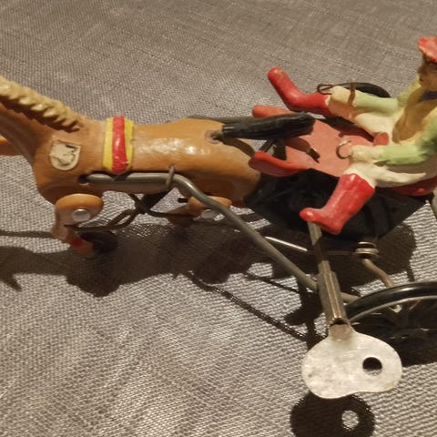 Hestene er av metall, den grnne filtflaten p banen er restaurert og i utmerket stand.