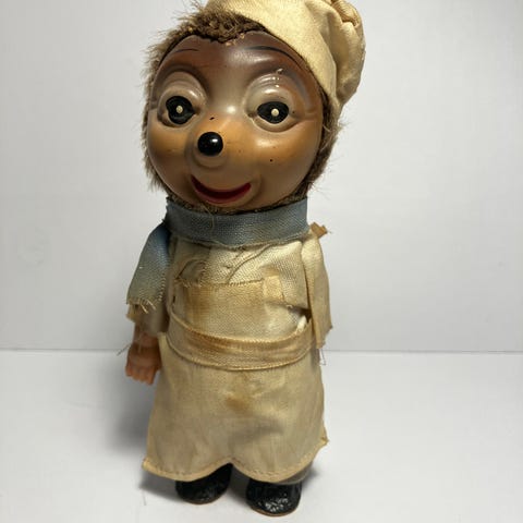 Steiff-nisse, modell Gecki, med gummihode, filtklr og kropp, og knapp/papir-etikett.