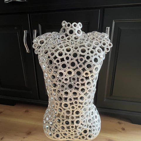 Slvfarget miniatyr av et kabinet- eller porselenskabinet, brukt som dukkehusminiatyr eller samleobjekt.