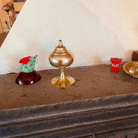 Den verste delen har pfyllingshullet for olje, utstyrt med sin originale kork festet til en kjede for hindre at den blir borte.