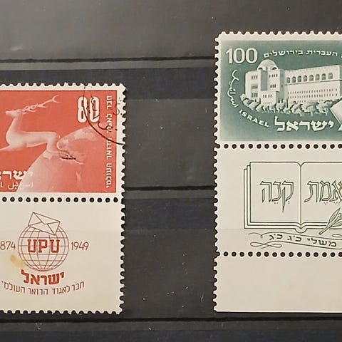Til salgs: et interessant parti av det svrt ettertraktede Menora-store frimerket nr. 55 i Bale-katalogen, utstedt av staten Israel i 1952.