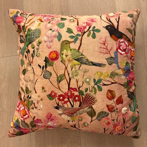 To fantastiske puter laget av Pierre Freys dyrebare broderte stoff Matriochka i fargen Folkore (90 % bomull, 10 % viskose) med bakside laget av flyelsstoff Monochrome 24 og to puter med et helhetlig utseende laget av flyelsstoff Monochrome 24 i bltt, en ekstra kvalitetsflyel fra Premium-kolleksjonen.