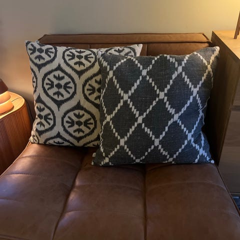 To fantastiske puter laget med Colefax and Fowler 'Kennet Stripe'-stoff i rd/grnn farge (50 % bomull, 24 % polyester, 22 % viscose, 3 % lin, 1 % polyamid) med bakside, og to puter med totalutseende laget med 'Monochrome 45'-flyelstoff, den ekstra kvalitetsflyelen laget som en spesiell produksjon av i-AMF.