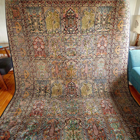 Denne teppetten er hndvevd i India av Kashmir-silke. Ren silke regnes som et av de mest kvalitetsrike og luksurise materialene for teppeproduksjon, og gir verkene et spesielt elegant utseende. Persiske teppevevere flyttet tidligere til India for utve sitt hndverk, og over tid har det utviklet seg en omfattende tradisjon for teppeproduksjon i landet. Mnstrene og fargene er inspirert av designene til klassiske persiske tepper. Mange hndknytte orientalske tepper kommer fra nord i landet. Kashmir-silketepper stammer fra regionen Kashmir, som grenser direkte mot Pakistan i nord.