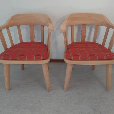 2 stk Peer Gynt armstoler i kvistfri furu fra Krogenæs Møbler. Robuste stoler i god vintage stand. Blå puter følger med.