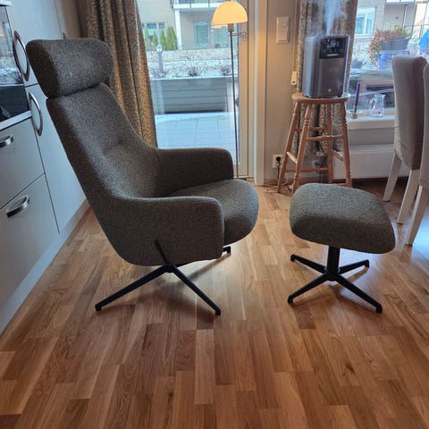 stordal, stordal lenestol, rund lenestol, design stol, lounge stol, moderne lenestol, krom understell, lenestol med krakk, kvalitetsstol, stue stol, norsk design, brukt lenestol, premium stol, komfort stol, miljøvennlig møbel, conform, Timeout,