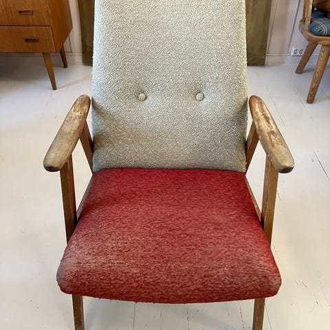 Nyrestaurert modell 301 designet av Ejvind Johansson for Gotfred Petersen i 1958. Johansson er best kjent for sin tid som leder for FDB Møbler i 1956-1958 - etter Børge Mogensen og Poul Volther. Av lenestoler er dette en av hans mest ettertraktede. Den er utformet med bein av eik og den karakteristiske buete rygg. Stolen er profesjonell nytrukket med Hallingdal 65 ull fra Kvadrat i sort og mørkerød. Stillig sak.