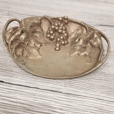Nkkel- og smting-fat i patinert gullbronse signert Max Le Verrier 1891/1973.