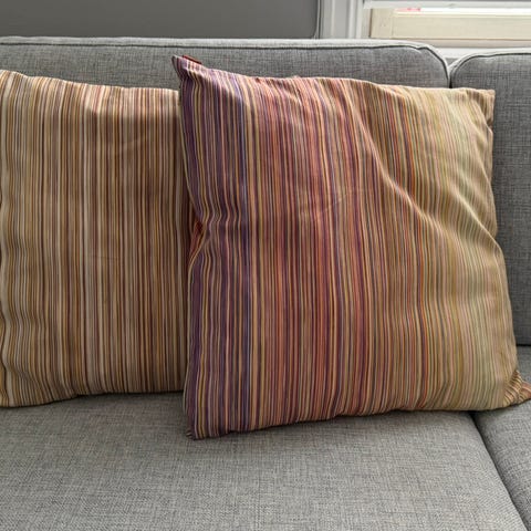 Utfrt p framsiden med stoff fra Missoni Home "Yosemite" (ref. 159/1Y4Q003), har et geometrisk mnster med fargereflekser som minner om fargene i solnedgangen; p baksiden derimot Missoni Home "Yzeure" (ref. 164/1Y4Q019), et jacquard boucl-stoff med melert bakgrunn.