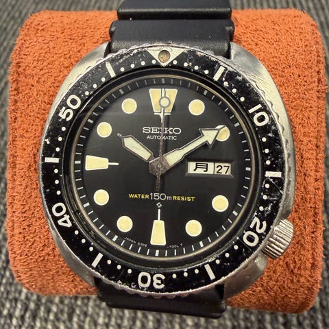 Selger et fantastisk eksemplar av Seiko Turtle vintage dykkerklokke 6309-7040, med en bezel som gr mot bltt, fantastisk, og indeksene som ogs er patinerte.