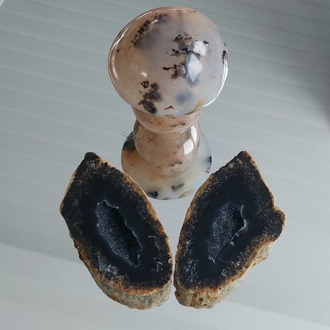 Fascinerende sett med tre polerte kuler av forsteinet tre p tilpassede stativer.