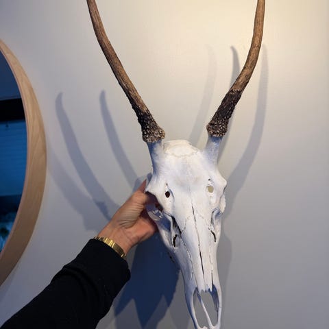 Det er en strikk festet til baksiden av hodeskallen slik at den kan monteres p veggen.