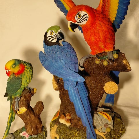 Dette gjelder et par veldig vakre rde papegyer / ara (Macaw) som kan henges i treet ditt eller p veggen. Fantastisk dekorasjon til hagen eller terrassen din! Dimensjonene p disse papegyene er per stykk: