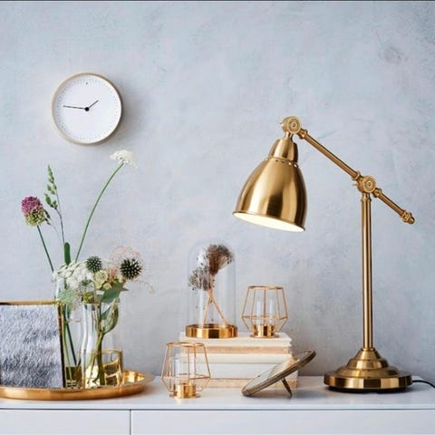 Materialer: Skjerm og grunnlag i hydensitets aluminium (speilchromfinish), arm i gullbelagt metall.