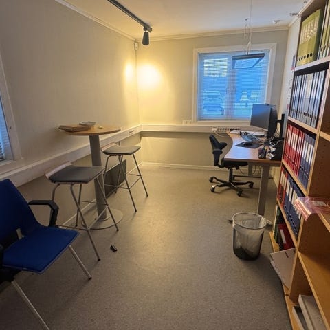 - Kontorinnredning med skrivebord, stol, acer skjerm, makuleringsmaskin, tastatur og 2 stk små skap