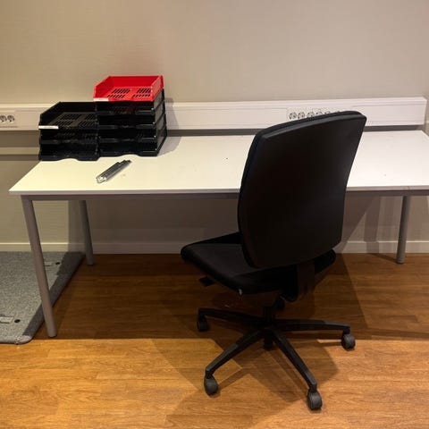 Kontorinnredning med skrivebord, stol, acer skjerm, makuleringsmaskin, tastatur