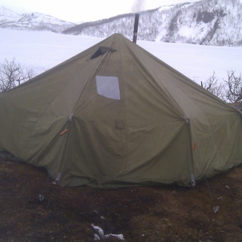 Bilde av oppslått telt med gammel type duk, er lånt med tillatelse av eier.