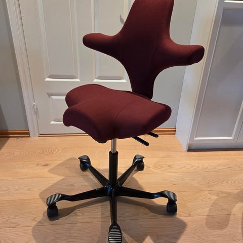 Produktbeskrivelse Ergonomisk kontorstol fra HÅG med et moderne og stilrent design. Capisco Plus 8020-modellen er utviklet for å fremme aktiv sitting og komfort gjennom hele arbeidsdagen. Den unike formen og den integrerte røde puten gir både stil og støtte i flere sitteposisjoner, noe som gjør den ideell for alle arbeidsmiljøer. Ergonomiske funksjoner Ryggstøtte: Justerbar ryggstøtte som tilpasser seg ryggen for optimal støtte Sete: Plastsete med integrert rød pute, for komfortabel sitting over lengre tid Justeringsmuligheter: Høydejusterbart sete (45 cm) og låsbar vippemekanisme (Liftomat: 200 mm) Spesifikasjoner Merke/Modell: HÅG Capisco Plus 8020 Materiale: Plastsete med tekstilpute Hjul: Designet for harde gulv Tilstand Stolen er i utmerket tilstand med minimalt synlige bruksmerker. All funksjonalitet fungerer som den skal, og stoffet er rent og pent. Den gir en flott ergonomisk støtte til enhver kontorarbeidsplass.