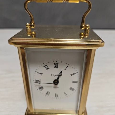 Til salgs str en elegant mekanisk bordklokke (stil reiseklokke) fra den tradisjonsrike Schwarzwald-produsenten August Schatz & Shne fra Triberg. Kapslingen bestr av polert messing med fasetterte glassskiver p alle sider, som gir innsyn i det presise urverket.