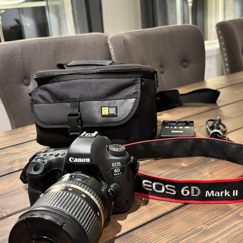 Denne auksjonen er for **Canon EOS 6D Mark II**, et alsidig og kraftig fullformat DSLR designet for entusiaster og profesjonelle fotografer. Som kombinerer en hyopplselig 26,2-megapiksel sensor med den avanserte DIGIC 7-bildeprosessoren og en fullt bevegelig berringsskjerm, er dette kameraet et eksepsjonelt verkty for portretter, landskap og reisefoto.