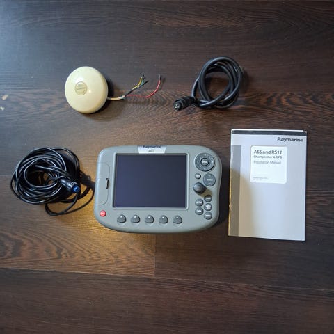 Selger en raymarine a65 kartplotter med kabler, rs12 gps sensor antenne, kartbrikke, brakett, solskjerm / cover og manualer.