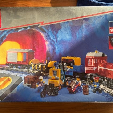 LEGO godstog fra 1980, helt komplett og testet i drift; boksen og bygginstruksjonen har bruksmerker, men er fortsatt brukbare.