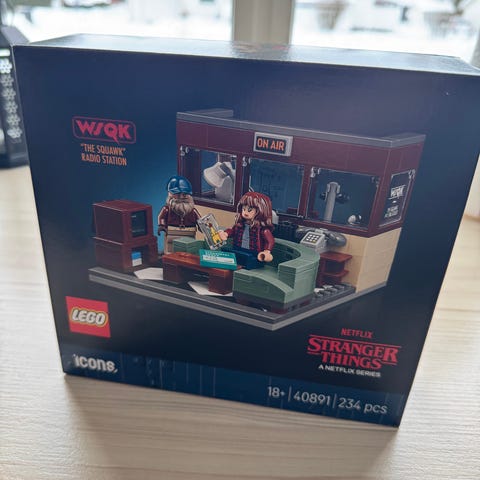 To Lego-sett, et unikt notatblokk i formen av et videobnd og tilhrende lys.