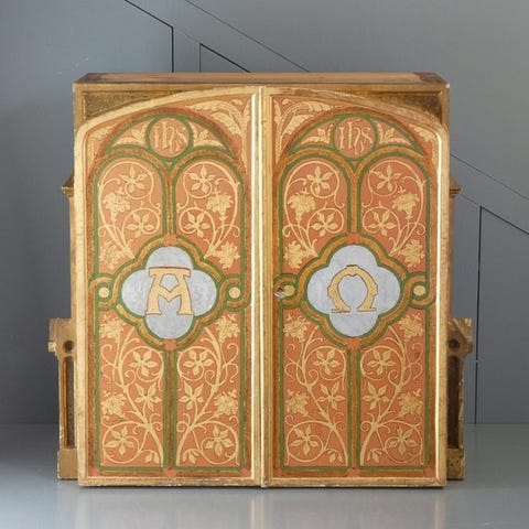 Et andaktsalter av tre, forgylt med bladgull, utskret i nybarokk stil, som forestiller Den hellige Treenighet.
