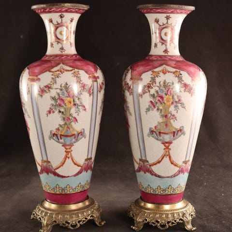 Malingen: De sentrale reservene (medailloner) huser hndmalte fargerike blomsterbuketter. Den malerteknikken viser en hy faglig dyktighet: myke penselstrk, delikate fargeoverganger og en livlig pastellpalett, typisk for den beste tradisjonen innen fransk keramikk.