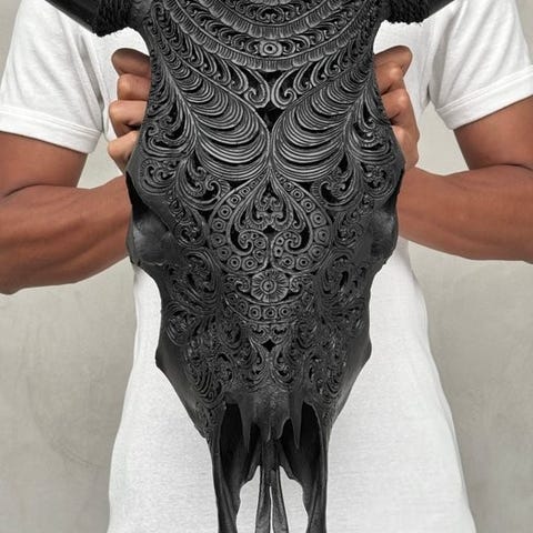 Et stort hndgravert oksekranie, gravert av hndverkere som har viderefrt den gamle kunsten gravere fra far til snn. Skallen er fullt ut skret for hnd med stor omhu. Det er et uvanlig, dekorativt stykke.