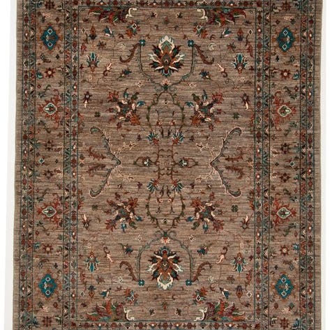 Vakkert hndknyttet designer-teppe med tradisjonelt inspirert Samarkand-mnster. De fine geometriske kantbndene og den harmonisk stripete feltutformingen gir teppet en elegant, rolig effekt. Kombinasjonen av varme naturtoner, bl og rustnyanser gjr det spesielt hjemmekoselig og allsidig bruke perfekt for stue, spisestue eller arbeidsrom.