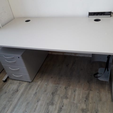 6 stk kontorbord med hev og senk 180x90 cm og kontakter på undersiden.4 stk grå bakvegger