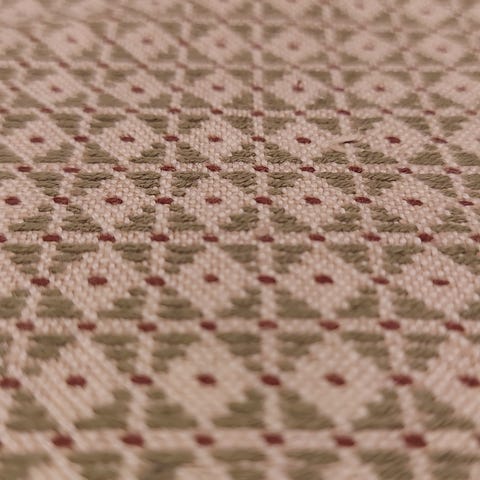 Motivet flger en klassisk rutenettgeometri, der hver rute er definert av gyldne vev og salviegrnne og antikkrosa nyanser som mtes i sentrale knuter som er brodert i relieff.