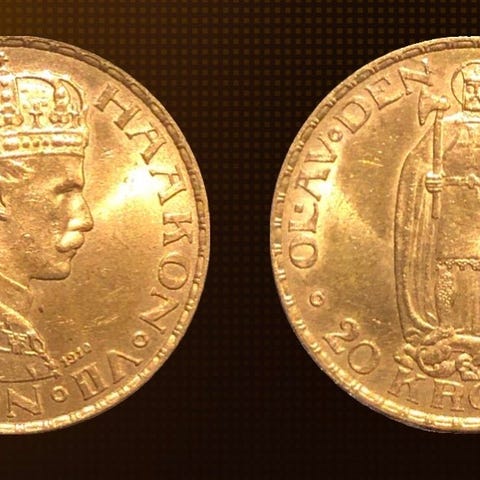 20 lire i gull med finhet 900/1000. Kongeriket Italia. Vittorio Emanuele III. Mynt preget for det frste jubileet av Marsjen mot Roma. Tilstanden er utmerket, akkurat som p bildet. Diameter 21 mm.