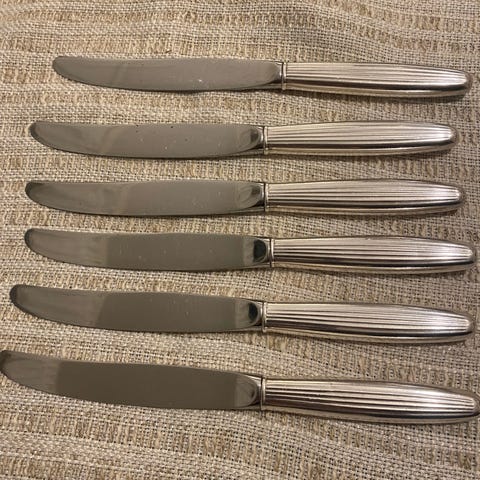 SOM NYTT. STEKESETT Kniv 28 cm Gaffel 25 cm kr 1600. 12 Kniver langt skaft 20,5 cm. kr 450 pr. stk. 10 kniver 21 cm kr 450 pr. stk 6 Store kniver 23,5 cm kr 500 pr. stk. Deler opp. Sender