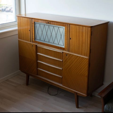 Dette skapet er ikke bare et oppbevaringsmøbel, men et kunstverk i seg selv. Det passer like godt inn i et moderne hjem som i en klassisk retro-inspirert stue. Med den nye belysningen og det unike glasset blir det et selvskrevent midtpunkt.