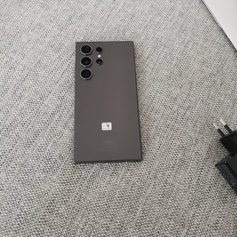 Selger en pent brukt Samsung Galaxy S24 Ultra i fargen Titanium Gray. Dette er toppmodellen med 12GB RAM og 256GB lagringsplass.