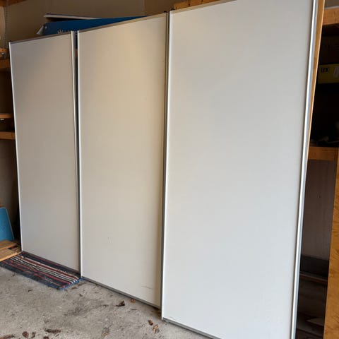 2 stk dører med skinner selges. Stått kort tid i utstilling.