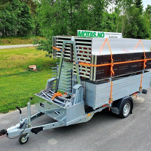 I pakken er det også med ny type stillashenger med V-drag, den har hele 1350 kg i nyttelast. Denne hengeren har lavt tyngdepunkt og er markedets største enakslede stillashenger.