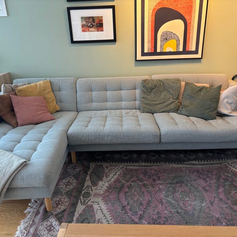 Støtten i seteputene, den myke overflaten på trekket og den stramme passformen gir denne sofaen perfekt balanse mellom komfort, funksjonalitet og utseende. Den rommer plass til hele kohorten og vil gi et par herlige kaffestunder i lokalet, før den forsvinner på hau ut og finner seg et nytt hjem fylt med kjærlighet.