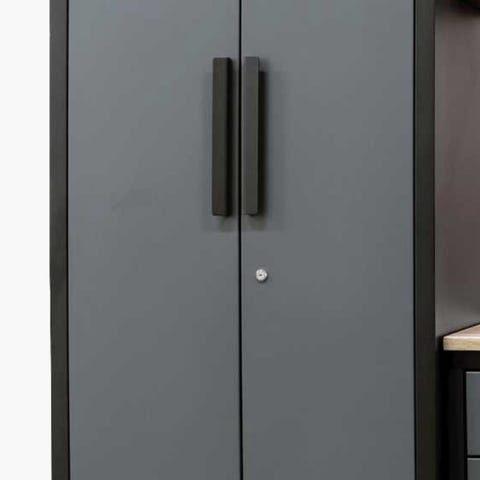 Kombinert verktøyvogn, verktøyskap og arbeidsbenk i en lang utgave med en bordplate på hele 215 x 50 cm og hullplate bakvegg. En virkelig kraftig løsning med 38 mm bordplate og også 12 løse kasser til oppheng på hullplaten. Dessuten er det i alt 10 skuffer i forskjellige størrelser og 1 stort skap og et håndtak til å flytte vognen rundt. Bemerk også de kraftige hjulene, hvor de 2 foran er med bremser.