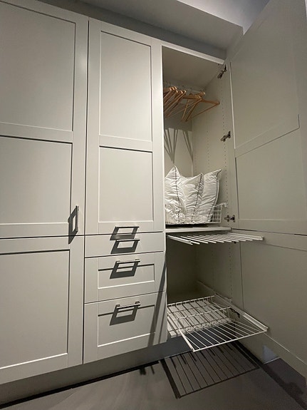 -Høyskapet ytterst er uten innredning, og hvis det plasseres et kjøl/frys der, har du et komplett kjøkken.