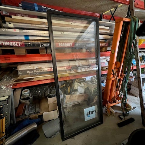 Døren har vært montert og fremstår i synlig brukt stand. Det er noen mindre kosmetiske skader, men ingen kjente funksjonsfeil.