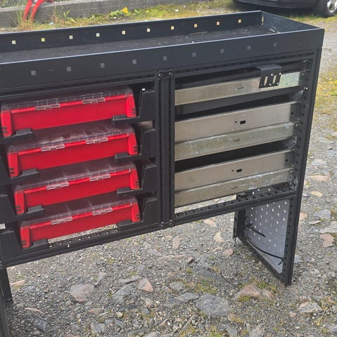 1 Sortimo innredning med skuffer, kofferter og div holdere. Lengde 154cm, dybde 39cm, høyde 108cm.