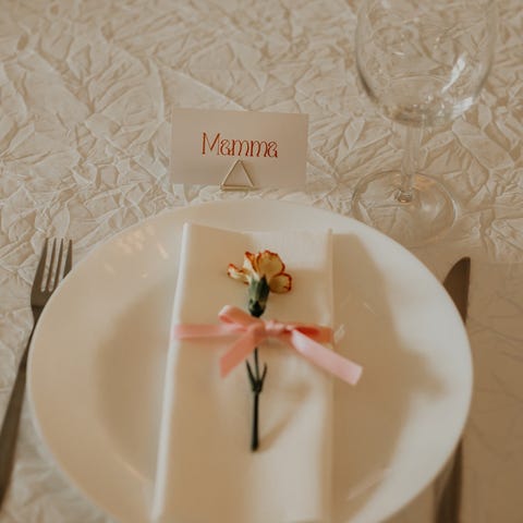 Hvert bånd forsegles på endene, og leveres i en lengde på 70 cm (2,5 cm bredt), ideelt for å knyte rundt glass eller som en dekorativ sløyfe på tallerkenen. Hvert bånd leveres flatt (ikke bundet) med gjestenes navn på.