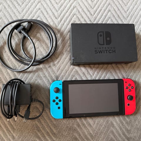 Selger en nintendo switch konsoll med docking stasjon, orginal lader, joy grip kontroll, stropper og hdmi kabel.