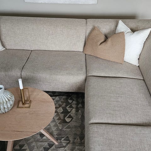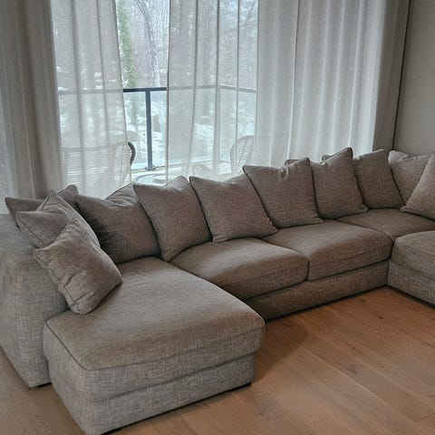 Fin mørk beige U-sofa. Åpen ende på begge sider. En romslig og praktisk familie- eller vennesofa :)