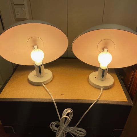 Begge er originale lampe fra Louis Poulsen. Påmontert ny 3 meters kabel med eurostikk som passer til både jordet og ujordet kontakt på begge.