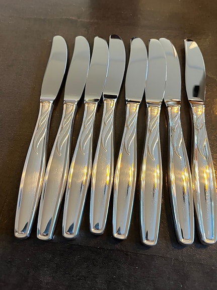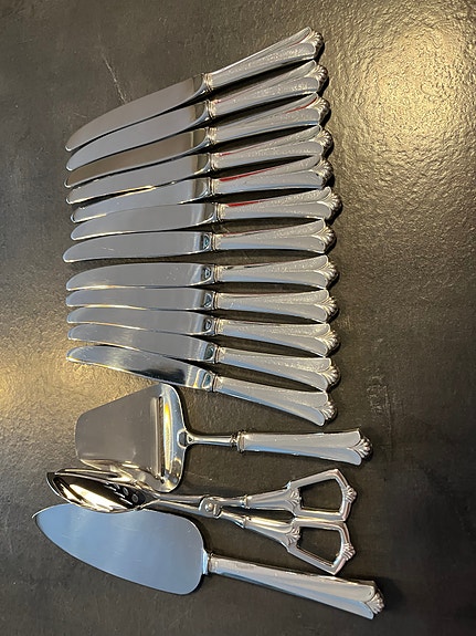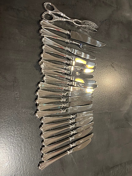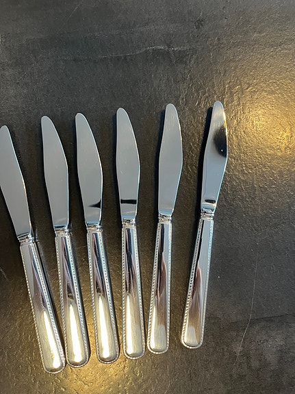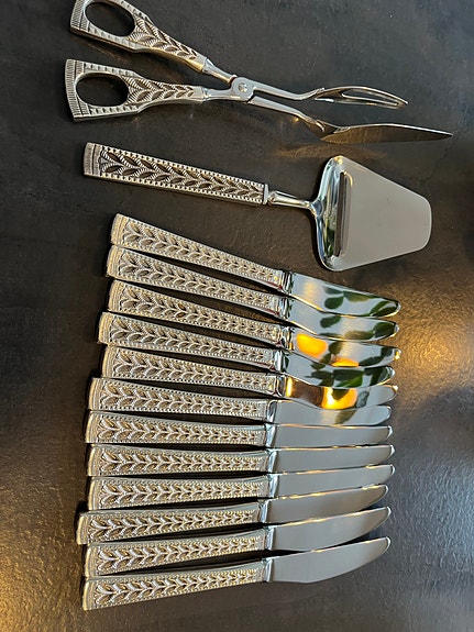 7 KNIVER 20,5 cm kr 450 pr. stk. 2 OSTEHØVLER 23 cm kr 450 pr. stk KAKESPADE 25,5 cm kr 450. PAISPADE 27 cm. kr 450. DELER OPP. SENDER
