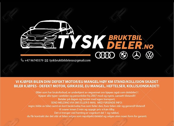 TYSK BRUKTBILDELER AS er et norskregistrert firma som spesialiserer seg på kjøp av brukte biler og salg av originale brukte bildeler – med fokus på tyske bilmerker som Audi, BMW, Mercedes, Volkswagen og flere.